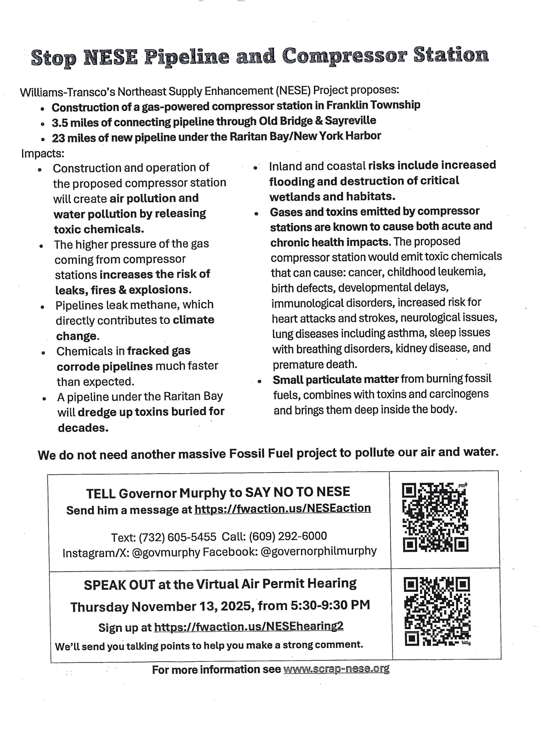 - Construction of a fracked gas-powered compressor station (the most polluting type) in Franklin Township near Trap Rock Quarry.